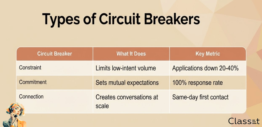 Circuit breakers are intentional friction points that interrupt the doom loop by adding value to each application. There are three types: Constraint (time-boxed postings, qualifying questions), Commitment (response timelines, visible accountability), and Connection (structured first contact, immediate engagement). Together, they surface real signals earlier, force better decisions before volume accumulates, and improve quality-to-volume ratio by 40% or more.