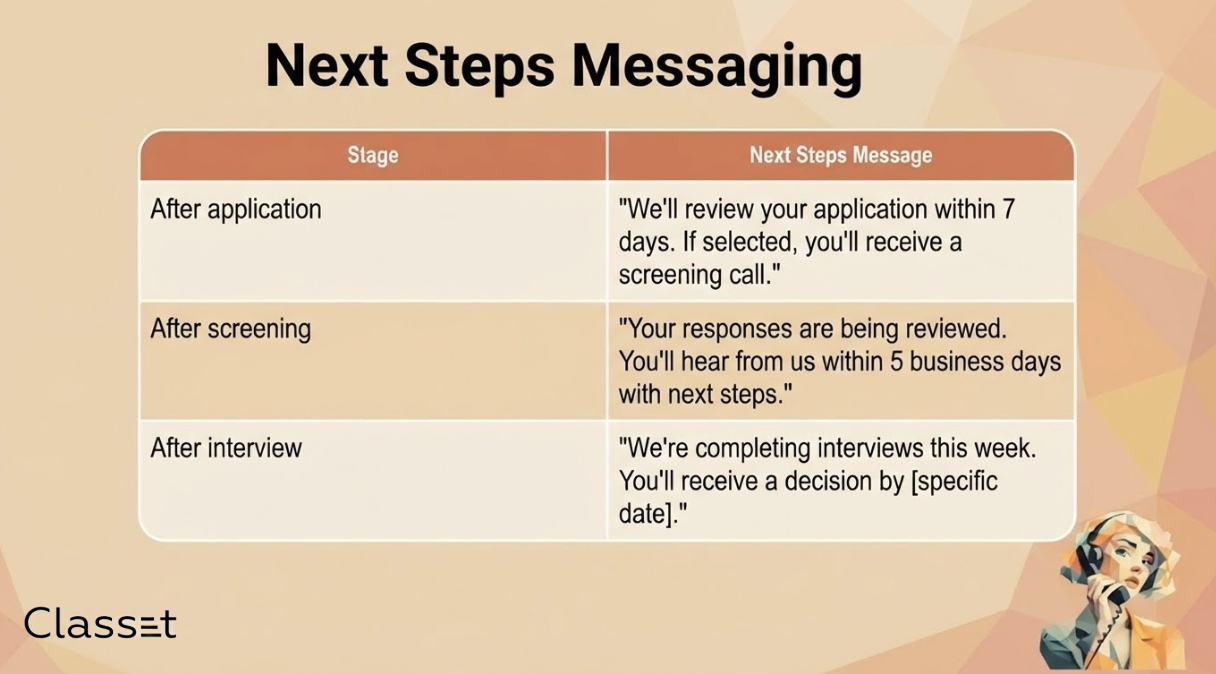 Every candidate should know: when I will hear back, and what the update will contain.