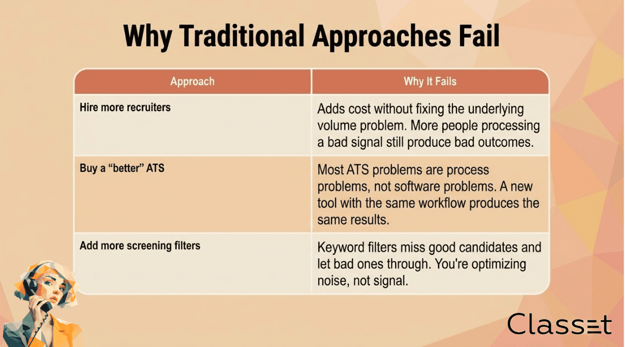 Your instinct is to process faster. Hire more recruiters. Leverage better filters. Speed up the funnel.